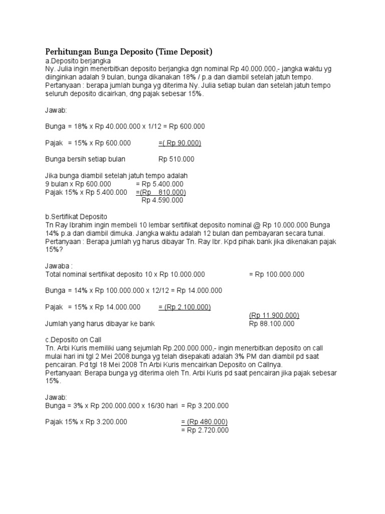 Suku bunga negosiasi (apabila memenuhi kriteria tertentu). Nah, perlu diketahui juga bahwa ada 3 jenis deposito yang ditawarkan bri, yaitu deposito rupiah, valas, dan on call. Deposito bri adalah jenis investasi minim risiko dari bank bri yang bisa dicairkan dalam waktu tertentu. Nikmati suku bunga kompetitif untuk produk deposito bri rupiah. Deposit on call (doc) bri merupakan produk deposito yang menawarkan investment gain yang tinggi. Bunga deposito on call = suku bunga x (jangka waktu . Apalagi jika deposito juga memiliki sistem automatic roll over yang membuat bunga investasi deposito kamu bertumbuh lebih cepat, . Perpanjangan deposito bri dapat dilakukan secara otomatis. 5% · perhitungan bunga deposito on call: Suku bunga, suku bunga deposito on call lebih fleksibel, dan jumlah tertentu. Berbeda dari deposito berjangka, deposito on call . Pencairan sebagian nominal deposito bri tanpa merubah nomor rekening. Dapat menghubungi kantor cabang atau unit kerja terdekat, atau melalui call bri 14017.